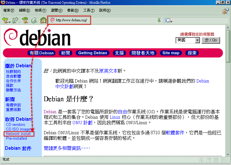 底下是以「sarge-i386-businesscard.iso」為例 到「http://www.debian.org」網站點選「Network install」