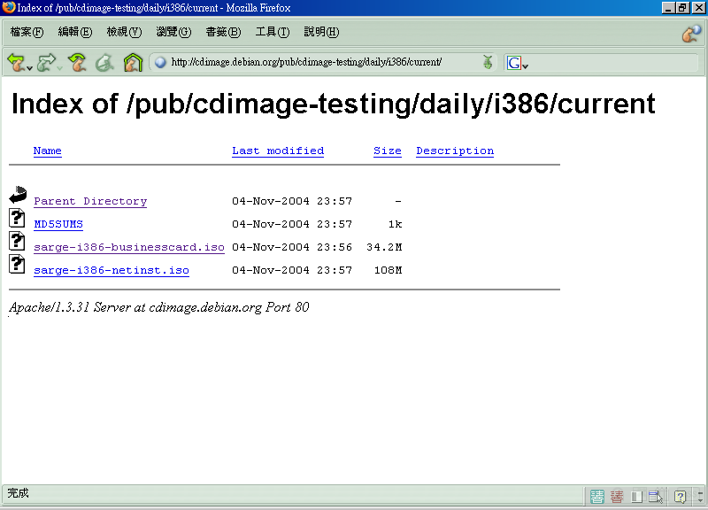 下載「sarge-i386-businesscard.iso」 註:下載回來的光碟映像檔,請不用燒錄,因為我們後續的所有操作是不需要燒錄光碟的。 |