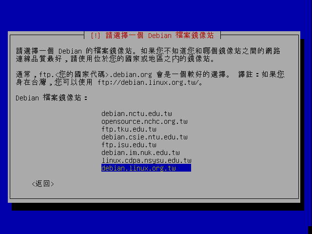 選擇 Debian 檔案鏡像站:您可以挑選離自己比較近的站台,以後所需要的檔案都會從這個鏡像站下載安裝,筆者習慣使用「debian.linux.org.tw」